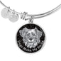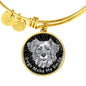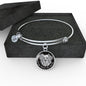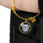 This elegant grey/black round pendant bangle bracelet, with a smiling dog face printed on it, is a heartful statement for anyone to wear who likes dogs.