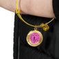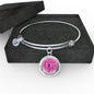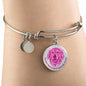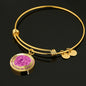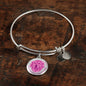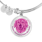 This elegant berry pink/metal round pendant bangle bracelet, with a smiling Golden Retriever face printed on it, is a heartful statement for anyone to wear who likes Golden Retrievers.