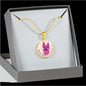 The necklace is available in two metal colors: "Gold" with 18K Gold Finish, or "Silver", made of high-grade surgical stainless steel (316L). The length of the chain is adjustable.