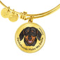 • This elegant Black and Tan/Bare Metal Dachshund (or Wiener) dog round pendant bangle bracelet, with a smiling Dachshund printed on it, is a heartful statement for anyone to wear who loves for this wonderful dog breed.