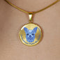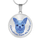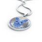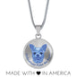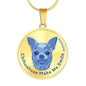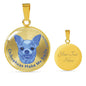 Show how glad you are about your Chihuahua dog by adorning yourself with this very stylish blue/metal Chihuahua round necklace, with a smiling Chihuahua design.