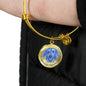 The bangle bracelet is available in two metal colors: "Gold" with 18K Gold Finish, or "Silver", made of high-grade surgical stainless steel (316L). The size of the bangle is adjustable.