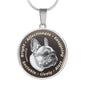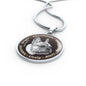 This elegant and highly informing grey French Bulldog round necklace has a picture of a French Bulldog as well a text describing the main characteristics of the breed.