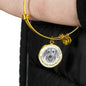 The bangle bracelet is available in two metal colors: "Gold" with 18K Gold Finish, or "Silver", made of high-grade surgical stainless steel (316L). The size of the bangle is adjustable.