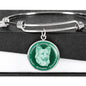 This elegant and very informing Mint dog round bangle bracelet, has a picture of a dog with a text describing the main characteristics of the breed.