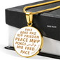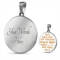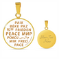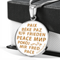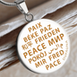 This beautiful and stylish necklace is a call for peace on earth, with the word Peace in 12 versions that represent 24 languages. White with gold-beige colored letters.