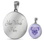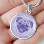 This elegant purple Pug dog round necklace, with a smiling Pug printed on it, is a heartfelt statement for anyone to wear who loves for this wonderful dog breed.