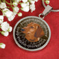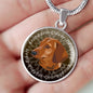 The text on the pendant says "Stubborn - Clever - Devoted - Lively - Playful - Courageous".