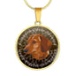 This elegant and highly informing Dark Brown Dachshund (or Wiener) dog round necklace has a picture of a Dachshund as well a text describing the main characteristics of the breed.