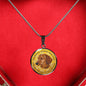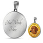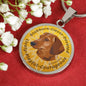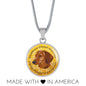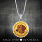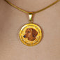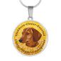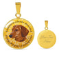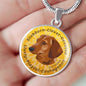 This elegant and highly informing Golden Yellow Dachshund (or Wiener) dog round necklace has a picture of a Dachshund as well a text describing the main characteristics of the breed.